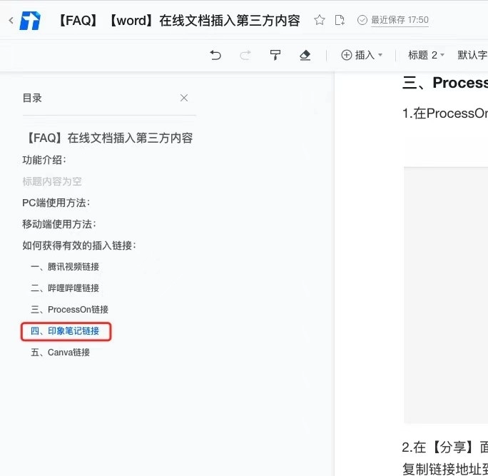 打开腾讯文档插入印象笔记链接—— 在腾讯文档电脑端打开指定的在线文档,在页面左上方点击“插入”,在下拉菜单中选择“第三方内容”,点击印象笔记,插入已复制的链接即可。