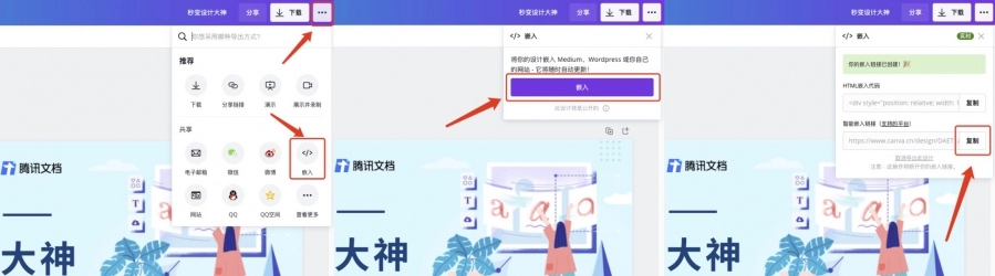 获取Canva可画作品链接—— 进入Canva可画网页端(www.canva.cn),打开一个设计作品,在编辑器入口选择页面右上角的“…”,点击“嵌入”按钮,在弹出框中选择“嵌入”,点击“复制”,即可成功复制链接到剪贴板中。