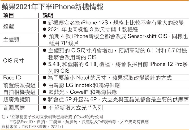 值得期待的是,今年的新款iPhone还在会拍照方面全面升级。根据来自《电子时报》披露的消息称,暂定名称为iPhone 12S的迭代产品仍会有四款机型登场,但主摄均会采用感光面积更大的CMOS图像传感器(CIS),预计6.1英寸和6.7英寸的高端版本将会改用全新的CIS,而5.4英寸和6.1英寸的低端版本则将使用当前iPhone 12 Pro系列的CIS。