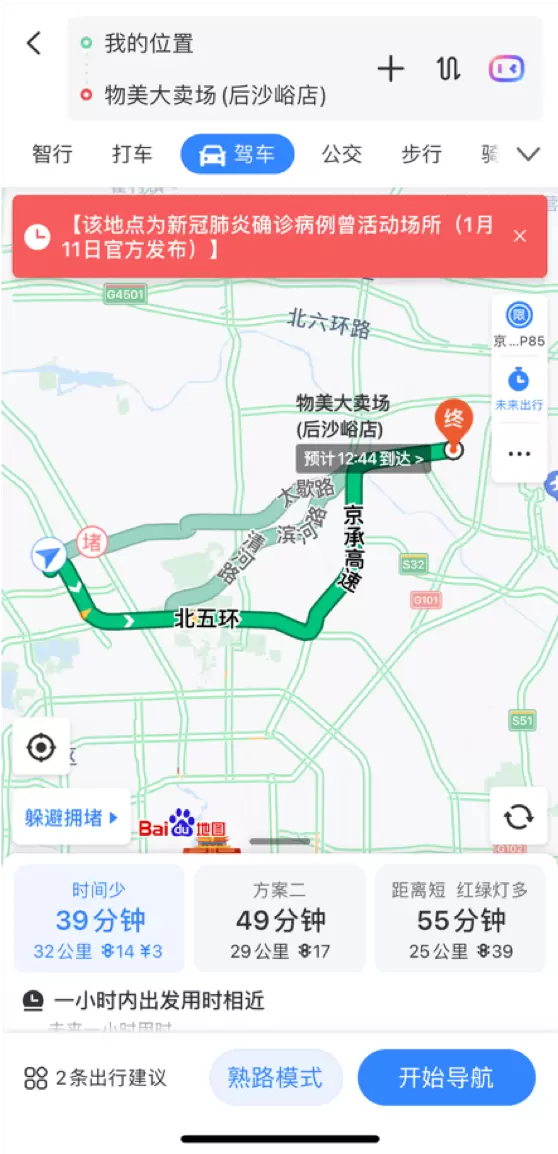 除了结合疫情政策、帮助用户做出合理出行决策之外,百度地图还会结合官方公布的疫情发生场所,在用户输入导航终点进行路线规划时,告知用户目的地是否为确诊病例曾涉及的活动场所,提醒用户提高警惕、做好防范。