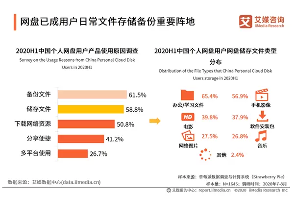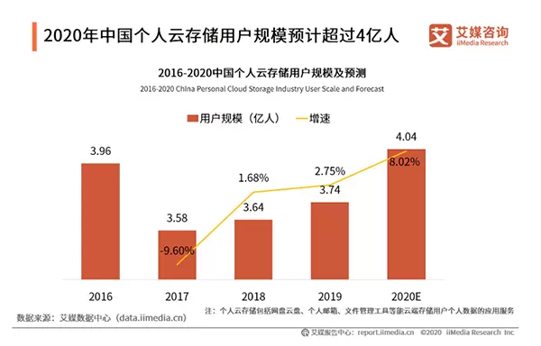 据艾媒咨询《2020上半年中国个人网盘市场现状及头部企业布局研究报告》指出,网盘已成为用户日常文件存储备份重要阵地,5G落地或进一步扩大其应用范围,2020年中国个人云存储用户规模预计超过4亿人。