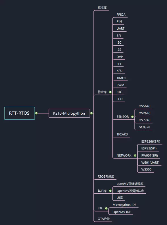 具体而言,在勘智K210-MicroPython的支持结构中,不仅包括标准库、特定库、RTOS系统库以及openMV图像处理和视觉算法库、UI库等,还提供了基于MicroPython和openMV的开发环境。