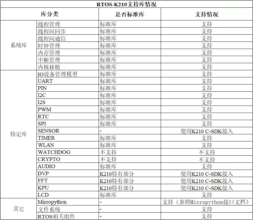 从上图可以看到,勘智K210支持RTOS系统标准库,例如线程管理、线程间的同步和通信、时钟管理、内存和中断的管理以及内核移植。同时勘智K210还支持IO设备管理、UART等12个特定的标准库。另外,开发者需使用K210 C-SDK接入该芯片特有的DVP、FFT和KPU软件库。