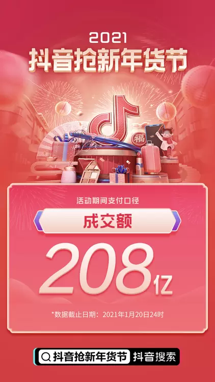 2021年,1月20日24点,抖音抢新年货节圆满落幕。抖音电商对外公布抖音抢新年货节整体销售战报,数据显示,本次抢新年货节中,平台活动期间支付口径成交额达到208亿。