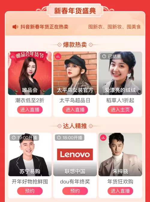 本次抖音抢新年货节期间,抖音电商上线秒杀会场、年货会场、主播会场三大会场。在年货会场中,设有王牌直播间、新春年货盛典、文化新年礼、新年上新礼以及匠心优选年货等专区,不仅方便用户快速找到想看的直播和想买的商品,更能为商家和达人的直播间进行快速导流。