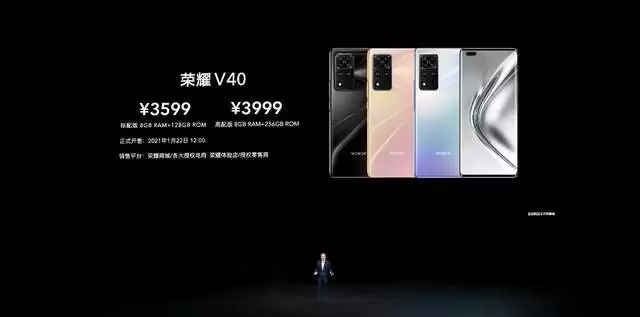 荣耀V40手机,采用一块支持10亿色、120Hz刷新率、300Hz触控采样的视网膜级超感屏,搭配重构秩序的先锋ID设计、全新升级的黑科技GPU Turbo X图形加速引擎、66W有线+55W双超级快充、X+Z轴双线性马达,致力于为消费者带来前所未感的使用体验。售价方面:荣耀V40有8GB+128GB,8GB+256GB两种配置,颜色有幻夜黑、钛空银、蔷薇金,分别售价为3599元、3999元、将于1月22日12:00开启全渠道首销。
