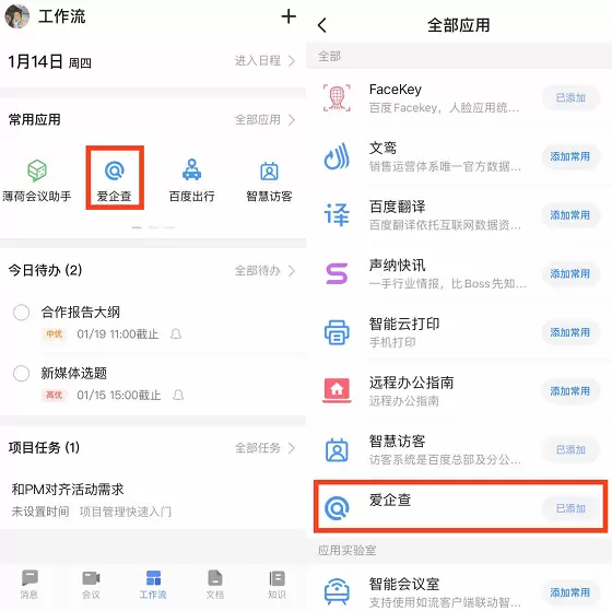 操作方法:用户可以在百度如流的“工作流”中点击“应用中心”,将爱企查添加到“个人常用”,该应用即可展示在首页。有效提升了企业查询的信息获取效率,也进一步强化了高效的一站式工作体验。