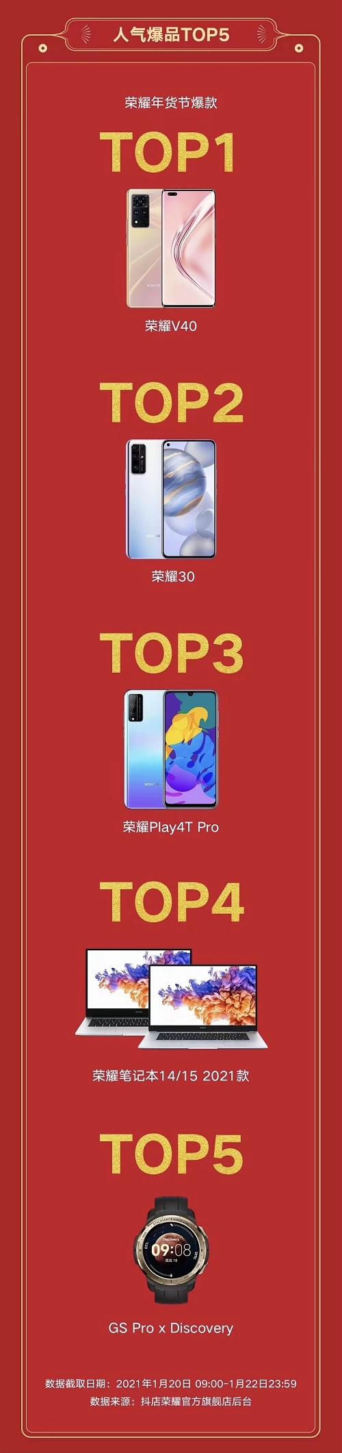 截止到1月22日24点,最受欢迎的明星爆款依次是,荣耀V40系列、荣耀30系列、荣耀Play4T Pro、荣耀笔记本14/15 2021款,荣耀手表GS Pro Discovery等。刚刚上市的荣耀V40系列人气超级火爆,首销仅3分46秒线上四大平台全部售罄,抖音直播首秀上架立刻秒抢空,消费者绝对是真爱了。