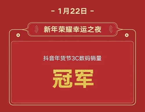 1月22日,荣耀公布新年荣耀幸运之夜超级战报,累计观看人数159万,总直播互动478万次,成功登顶抖音年货节3C数码销量冠军,超级人气产品荣耀V40系列夺得直播间人气爆品TOP1。取得如此骄人的战绩,足见消费者对荣耀创新科技产品的热捧,以及荣耀品牌爆发式的增长势能。