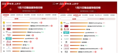 在品牌选择上,苏宁年货节悟空榜显示,截至1月25日11:11,品牌销售额榜单中,Tiffany、六福珠宝、周大福三大品牌位居前三,可见消费者倾向选择Tiffany。而品牌加购人数显示,周生生、周大福和周六福位居前三,且周生生品牌加购数据呈上升状态。