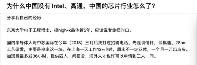 而在硕博这个阶段,薪资差距就更加明显。知乎上一个名为“中国的芯片行业怎么了?”的帖子浏览量近500W,其中一个高赞答主就分享了这样的经历,答主是东京大学研究晶体管方向5年的博士,前前后后收到中芯国际、华为海思、东京大学助教等数个offer,后因国内半导体企业开的工资远低于预期而选择在海外助教。