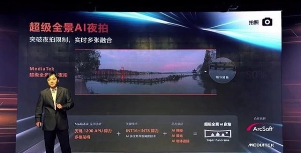为了进一步提升夜拍表现,联发科还与虹软科技共同研发夜间拍摄算法模型,使得天玑1200在夜拍时的拍摄性能提升50%。在拍摄全景过程中,可实现实时AI降噪、AI曝光、AI物体追踪等智能处理,让用户在暗光环境中也能捕捉到任何细节。