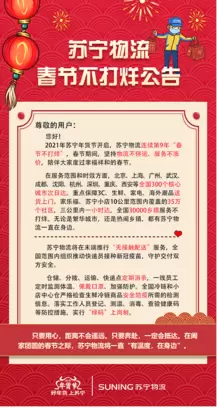 疫情挡不住春节的喜庆。1月20日,苏宁易购年货节正式启动,并宣布正式开启第九年“春节不打烊”活动,将以全方位的防疫措施,为用户提供与平日无差别的物流配送服务,以高品质服务保障消费者“就地过年”。