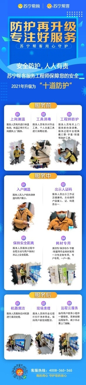 苏宁帮客“十道防护”标准涵盖服务前、中、后的全流程,包括服务前的体温检测;作业工具及个人交通工具的消毒杀菌;上门前的自身消毒;服务中的全程佩戴口罩/手套/鞋套等防护工具;入户前出示体温/工作证及健康码;服务全程主动与用户保持2米以上安全距离;清洁剂/保洁毛巾/手套/鞋套等作业耗材一次性定制专用一户一换;服务后的清洁处理机器;打扫并带走作业垃圾;指导用户使用小程序远程保修,减少非必要上门接触。