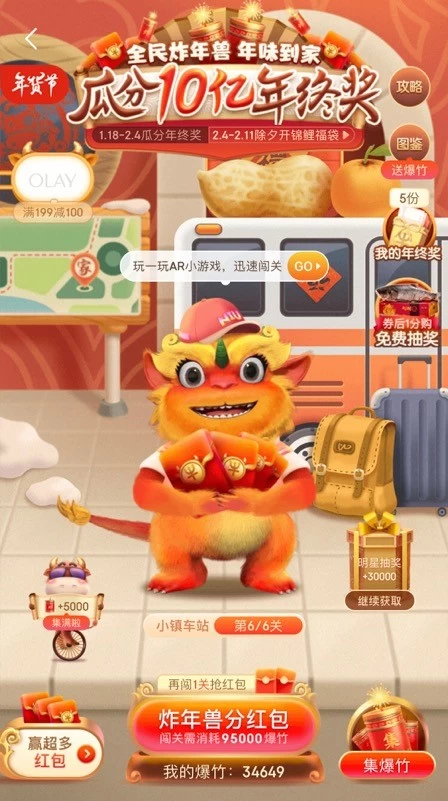 今年“全民炸年兽闯关分红包抽大奖”的主线玩法中,用户通过多种途径每日集爆竹从而开启闯关“炸年兽”关卡。闯关越多,瓜分奖励金额越高,闯关中还有红包奖励,小年夜瓜分奖池高达10亿。“白天攒钱大作战 晚上红包守卫战”的支线玩法,则用“白天抢红包,晚上守红包”的方式把春节收红包的习俗编织的妙趣横生。
