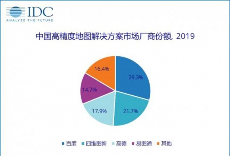 高精度地图有所不同,2019年IDC咨询发布中国高精度地图解决方案市场份额报告显示,百度目前市场份额最高,达29.3%,四维图新为21.7%,高德占14.7%。