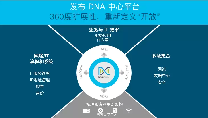 此次发布标志着思科率先打造了业界首个基于意图的开放性网络平台——DNA中心平台,能够跨园区、广域网、分支机构提供“东西南北向”的360度可扩展性。该平台借助超过100个API、SDK和适配器,充分利用网络所能提供的全部分析和洞察能力,使企业的开发人员可依据其自身优势和需求,灵活自如地对该系统进行编程,实现更高的安全性、更快的操作和更个性化的体验: