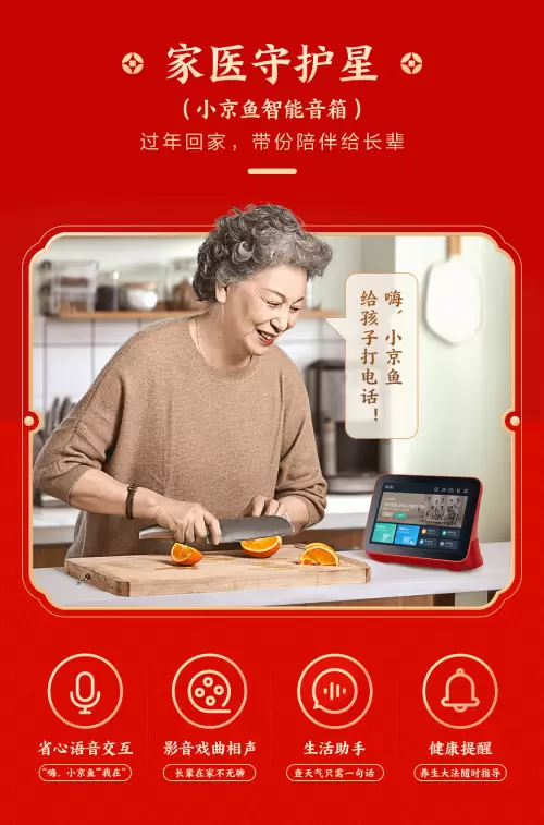 此外,作为搭载京东家医“孝心版”服务的硬件产品,升级后的“小京鱼”音箱不仅能够接通京东家医的在线问诊和健康服务,基于庞大的内容资源,它还可以为老人提供健康科普、新闻、音乐、影视剧、戏曲等信息和娱乐服务,以便捷的语音播报形式帮助老年人更轻松地获取各类资讯,让家中老人在互联网时代不与社会“脱节”。