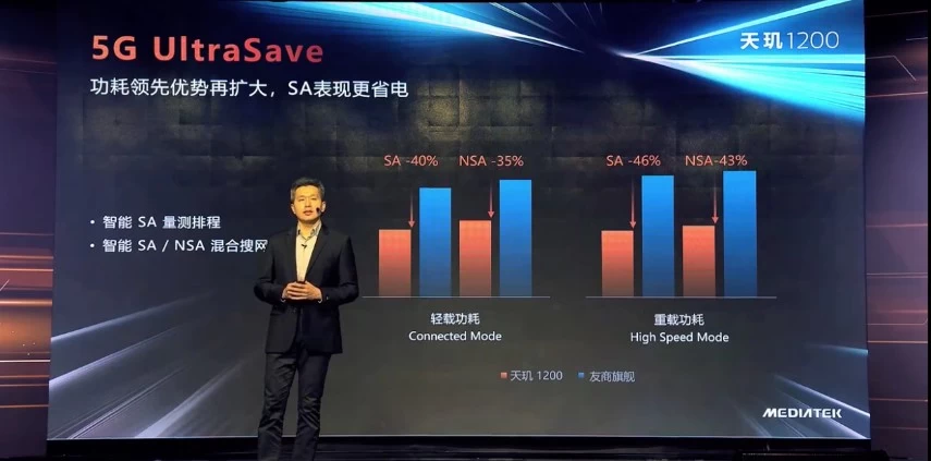 而在此次的天玑1200中,同样也搭载了MediaTek 5G UltraSave省电技术,并在原来的基础上对5G UltraSave省电技术再升级,通过智能SA量测排程以及智能预先切换SA/NSA混合搜网策略,让终端在5G SA组网模式下的5G功耗优化更为突出,在用户日常高频的手机轻载和重载使用场景下,功耗表现领先竞品旗舰40%以上。