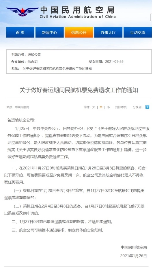 1月26日,民航局下发通知,明确自1月27日0时起,凡在1月27日0时前购买1月28日至3月8日春节期间机票的旅客,均可办理免费退票或至少一次改期。