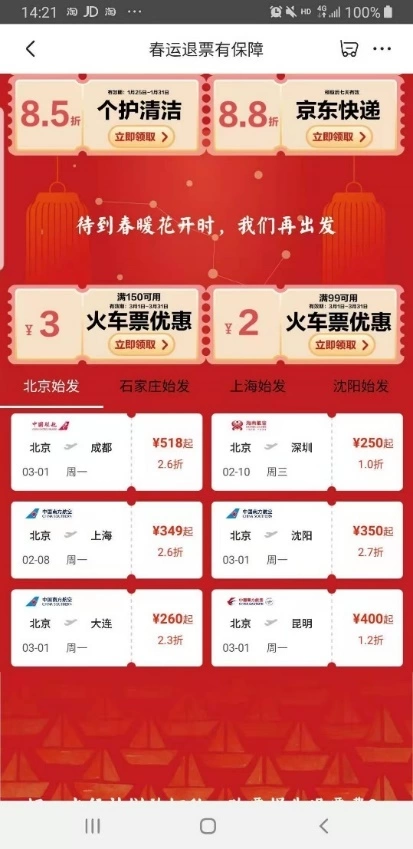 作为春运订票主要平台之一的京东,在第一时间响应民航局政策,推出“春运退票有保障”服务,向已经订票的消费者推送免费退改短信,保证消费者的权益。除百分百执行铁路部门和民航局的相关政策之外,如果用户办理退票,京东旅行还会在退票受理短信中推送京东年货大礼包,里面有“三只松鼠满300-180”、“泸州老窖满399-50”、“个护清洁8.5折”、“京东快递8.8折”等超多年货优惠券免费领取,让更多决定留在原地过年的原年人,即使不回家也能为家人送上一份新春祝福,也可以用更优惠的价格踏踏实实为迎接春节“囤年货”。除此之外,京东旅行还为大家提供了很多三、四月份出行的低价预售机票,方便大家在疫情缓和、春暖花开之际出行游玩、归家团圆。
