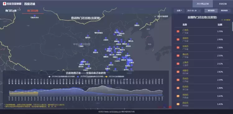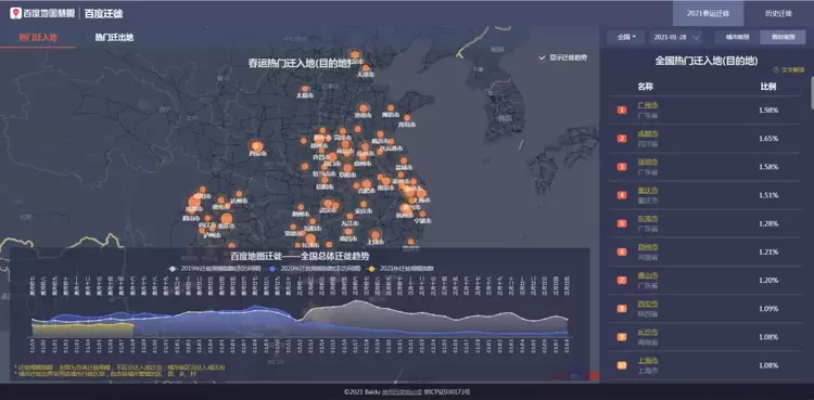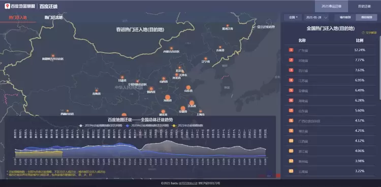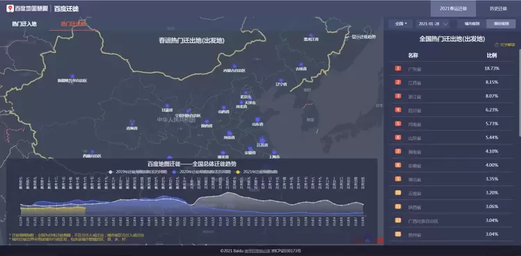 1月28日,2021年春运正式拉开帷幕,作为疫情防控常态化后的第一个春运,今年的春运客流和迁徙趋势备受瞩目。为辅助相关部门开展春运防疫工作,百度地图迁徙大数据平台更新上线,提供覆盖全国各省市的多维迁徙数据参考。据百度地图迁徙大数据平台显示,2021年春运首日,全国总体迁徙规模与2020年及2019年农历同期相比大幅下降,较新冠肺炎疫情前的2019年春运首日下降34%。在多地“就地过年”的号召下,今年春运迁徙热度较往年“平淡”了不少。
