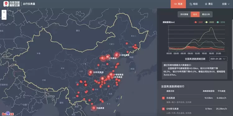 而参考百度地图另一时空大数据平台“百度地图出行仪表盘”数据,可以更细化地看到,春运首日,全国高速路拥堵情况较往年春运首日下降,这也从侧面体现出,相当一部分公众响应政府“就地过年”的号召,贡献自己的抗疫力量。