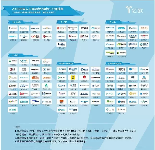 据了解,《2018中国AI商业落地100强榜单》是亿欧智库经过数月时间,大量走访AI企业与投资机构,通过获取的访谈信息和构建收入推算模型(以公司的营业收入、客户质量和数量、客户美誉度为主要评判指标,同时参考投融资、创始团队背景、产品和服务能力等基础信息),以中国AI企业在2018年的营收情况为考量标准来进行排名的。这是中国第一份基于全国调研的、以“商业落地”为立足点的人工智能企业榜单,目的是贯彻国家人工智能发展战略,为鼓励企业以创新驱动,优化结构升级,加快迈向人工智能2.0时代而开展的评选活动。