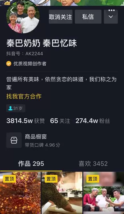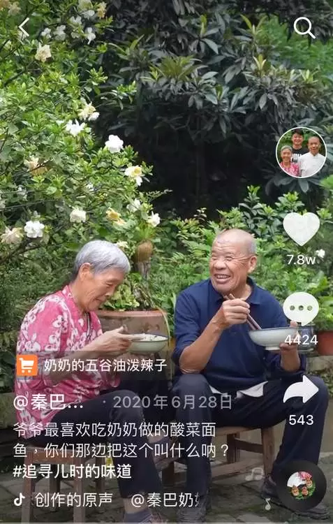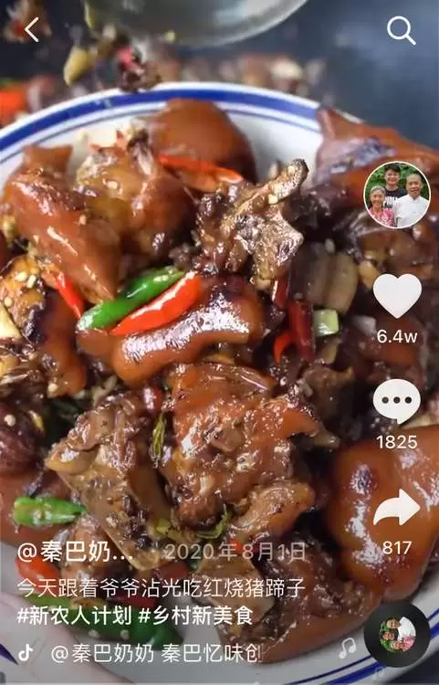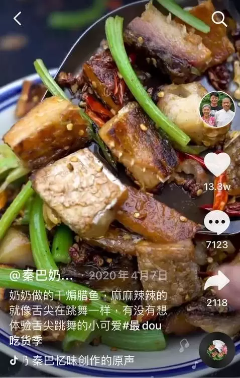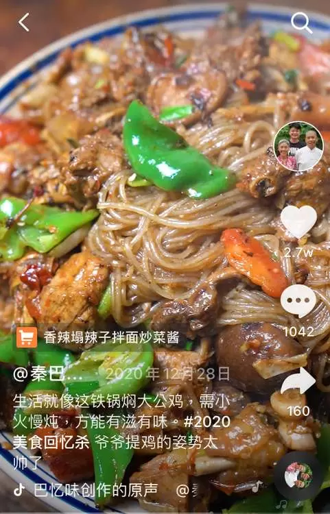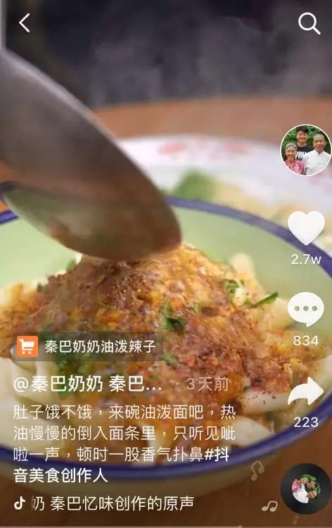 自张万露开通@秦巴奶奶 秦巴忆味 这个抖音账号以来,已有274.4万粉丝在他的短视频里体验过“云吃饭”。除了烈火烹油的油泼面,还有酸爽滑嫩的浆水面鱼、肥美丰润的红烧猪蹄、软糯香甜的红糖糍粑、焦香麻辣的干煸腊鱼……在陕西安康这个平平无奇的农家灶台前,“秦巴奶奶”陈桂刚的巧手端出一碗又一碗美食,馋哭了网线那头的一众网友。