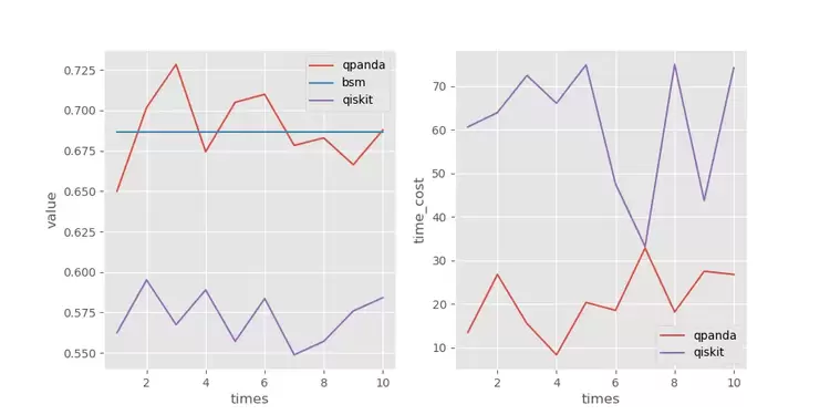 (红线为本源量子期权定价应用在QPanda中的运行数据,蓝线为国外同类产品的运行数据)