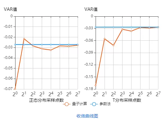 与量子期权定价应用较为相似,VaR值计算算法也应用了量子振幅估计相关的算法来实现对经典蒙特卡罗方法的双对数级别的量子加速,最后获得一个稳定的VaR值计算值。为了验证算法的正确性研究团队同样也使用参数法作为对照查看量子蒙特卡罗法的收敛情况:
