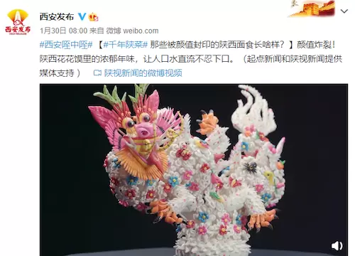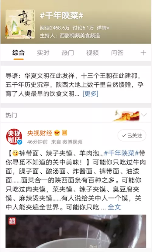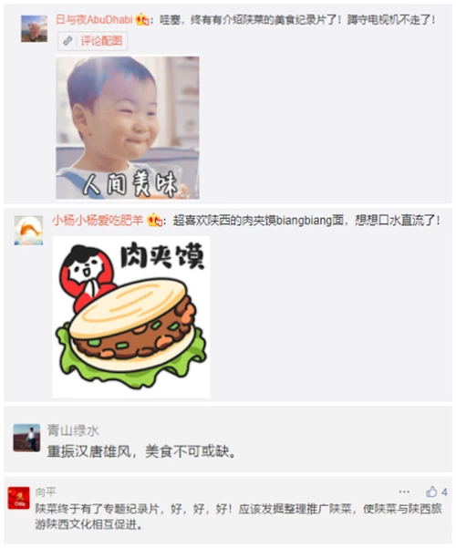 爽滑酥嫩的烤乳猪、香醇诱人的奶汤锅子鱼、口齿留香的岩耳炖鸡、芳香四溢的紫阳蒸盆子、薄如蝉翼的泡泡油糕、咸香肉糯的缸腌腊猪肉、肥而不腻的长安糟肉……影片中超高清精致诱人的美食画面、动人的故事、一道道滋味万千的宫廷美食接连登场,《千年陕菜》开播后实力圈粉,让陕菜重新走入国人视野,超千万网友通过微博和抖音参与到《千年陕菜》的“云赏味”大赛中来。