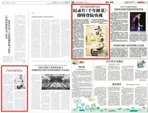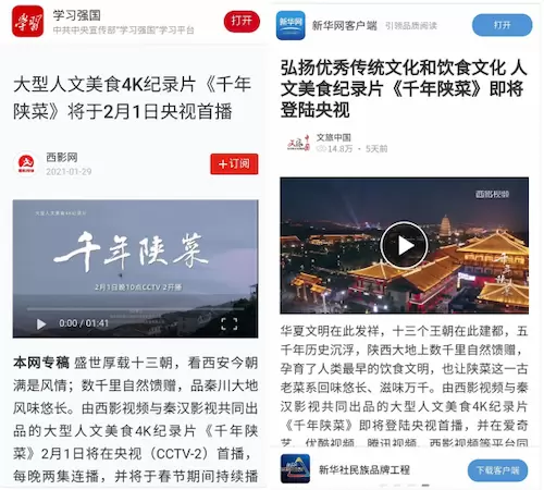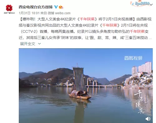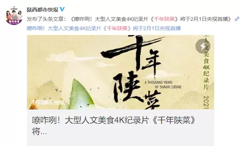 2月1日晚,由4K花园与西影视频、秦汉影视联合出品的人文美食4K纪录片《千年陕菜》第一、二集在央视二套首播,根据三方收视率数据显示,该片播出时段实时收视进入全国前十。随着央视的热播,千万观众领略传承千年陕派的悠久美食文化。据悉,“千年陕菜”的新浪微博话题、抖音话题关注度超过2000万,为全国观众送上一道美味“珍馐”。