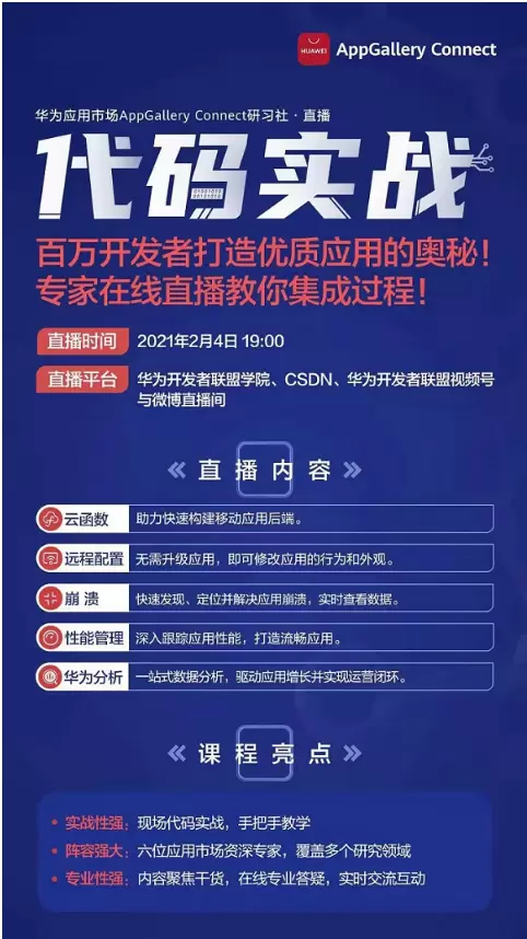 2月4日19点,华为应用市场AppGallery Connect专家团队将在线为大家带来丰富干货解读:涵盖云函数、远程配置、崩溃服务、性能管理、华为分析5个单服务,帮助开发者提升应用质量与开发效率。
