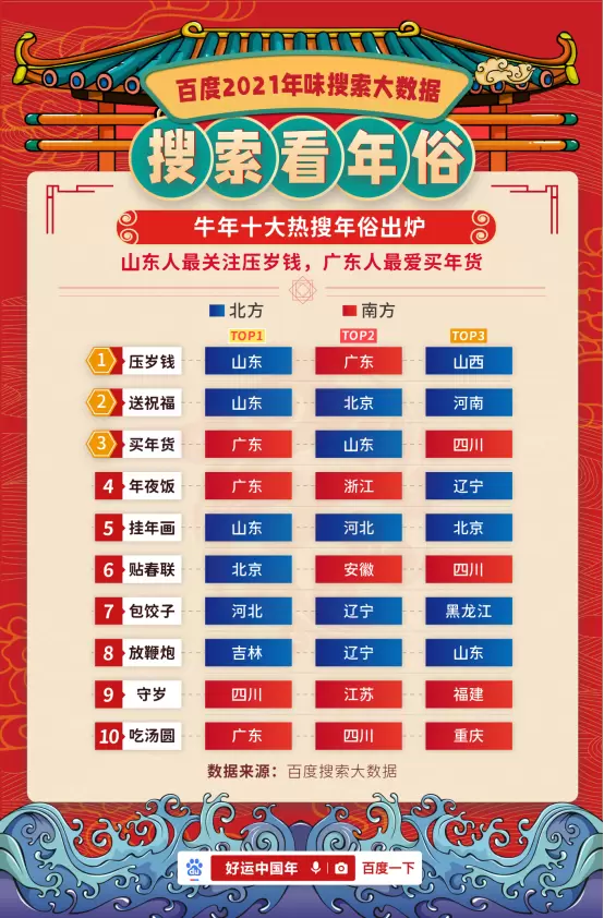 习俗五花八门,南北大有不同。数据显示,南方地区更关注守岁、吃汤圆,北方地区则对包饺子、放鞭炮更上心。山东、广东、四川多次上榜,成为牛年春节“年味最浓”的地区。