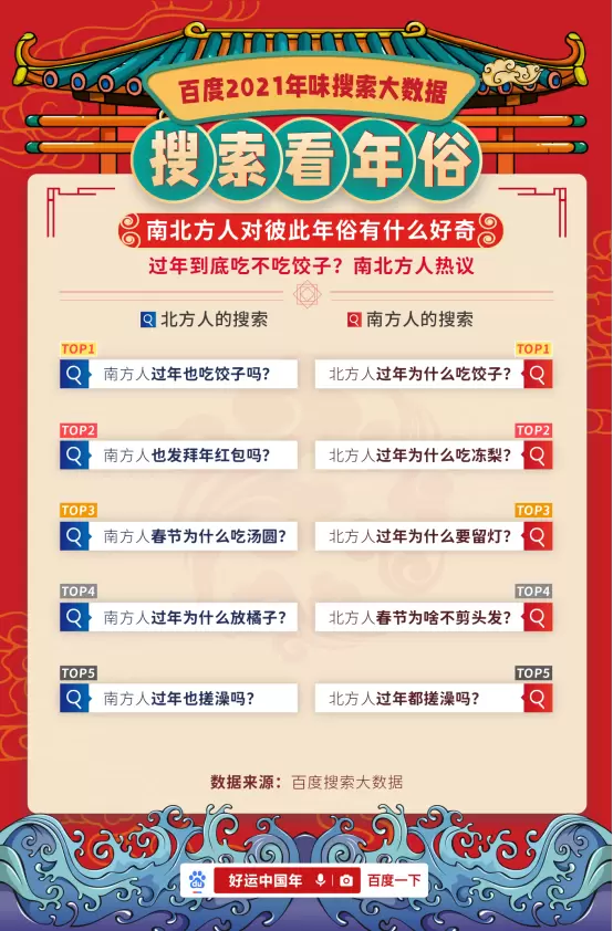 南北习俗不同,引来彼此不同的好奇。数据显示,南方人好奇北方吃饺子、吃冻梨、留灯、正月不理发与搓澡等年俗。而北方人的问题是南方人会不会像他们一样照做:“南方人也发拜年红包吗”、“南方人过年也搓澡吗?”等代表了他们的好奇。有趣的是,春节吃汤圆还是吃饺子、要不要搓澡,成为南北方人共同的热议话题。