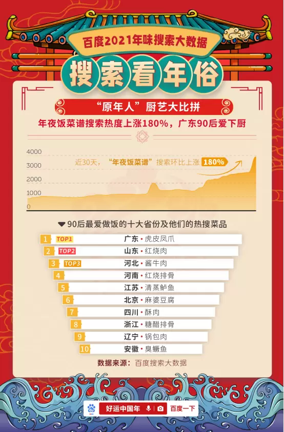 百度2021年味搜索大数据:“年夜饭菜谱”环比上涨180%,广东90后爱下厨