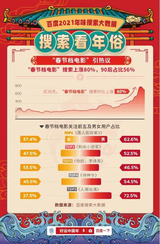 解决完年夜饭的问题,年轻人的注意力聚焦在了看电影这件事,“憋了大半年”的中国人,对牛年春节档电影充满期待。数据显示,近30天,“春节档电影”搜索环比上涨80%,其中90后年轻人占比56%。