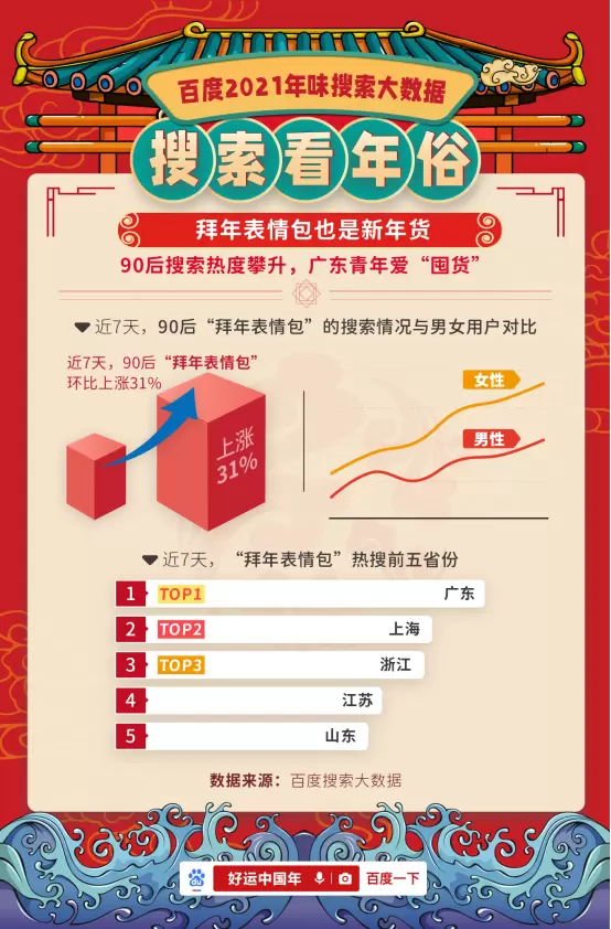 数据显示,近7天,90后“拜年表情包”的搜索热度环比上涨31%。女性远高于男性,成为春节期间“表情包社交”的主力。其中,广东、上海、浙江等南方地区关注度最高,“表情包社交”已经成为年轻人迎接新年的新方式。