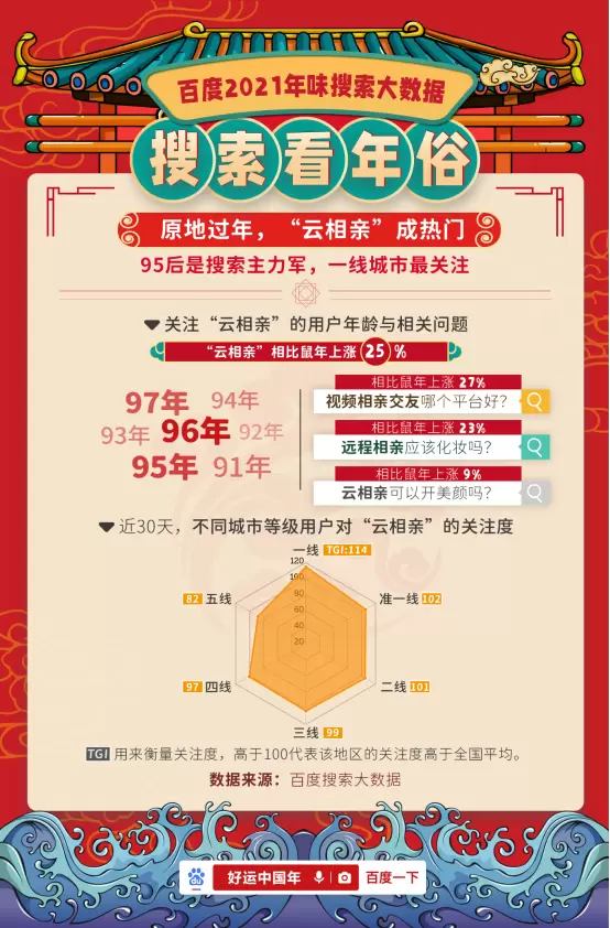 近日,百度发布《百度2021年味搜索大数据》,从中国人的搜索行为出发,讲述今年的年味特点与变化。传统年味还在延续,南北年俗各有不同。“云过年”方式五花八门,老年人也在及时跟进……中国人的年味,都藏在了这些搜索里。