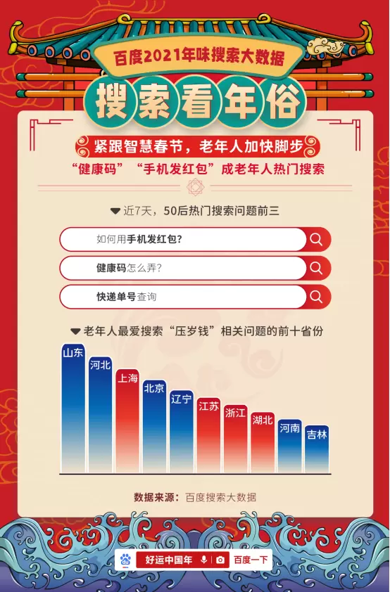 百度搜索大数据显示,近7天,50后老年人热门搜索问题分别为“如何用手机发红包”、“健康码怎么弄”、“快递单号查询”。这届老年人在与子女异地过年中,学会了通过发红包和寄快递表达思念。