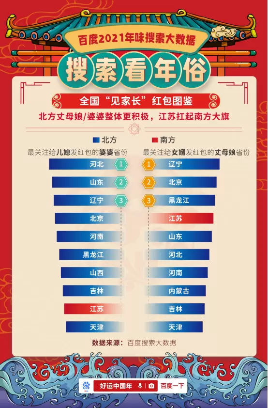 与此同时,春节期间为了迎接女婿、儿媳的拜访,(准)婆婆、丈母娘们对发红包这事儿也有更多思考。百度搜索大数据显示,东北、山东、河北等地区对女婿、儿媳红包的准备更为重视。与此同时,江苏婆婆、丈母娘则扛起了南方省份的大旗。