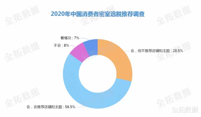 此外,超过80%的消费者表示会推荐密室逃脱给身边的人,其中28.5%表示只推荐密室逃脱游戏,但不推荐密室商家和主题,而56.5%表示会推荐具体的密室逃脱店铺和密室主题。由此可知,消费者在对于游戏体验好的密室逃脱店会有更强的重复消费和推荐意愿,因此树立良好的口碑对于密室逃脱商家来说有重要的意义。