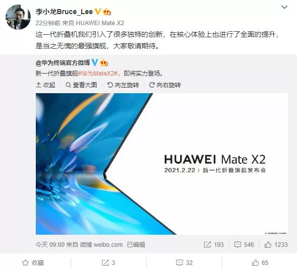 对于这款手机,华为第一手机产品线总裁、被称作Mate系列之父的李小龙在微博透露,这一代折叠机我们引入了很多独特的创新,在核心体验上也进行了全面的提升。他放言,“ 是当之无愧的最强旗舰,大家敬请期待。 ”