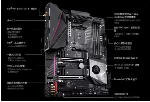 扩展性方面,X570 AORUS PRO WIFI提供了2组M.2插槽(其中一个支持PCIE4.0)和5组PCIE插槽(其中一个为PCIE4.0 X16),应付各种高端PCIE4.0 SSD和显卡毫无压力;配备1组前置USB3.2 TYPE-C扩展接口和1组雷电扩展接口以及1组WIFI6无线网卡扩展接口,方便发烧友玩家适配更多高端外设;后置I/O方面具有10个USB接口(其中一个为USB3.1 TYPE-C),1个HDMI2.0以及5个音频接口和1个数字光纤输出接口。总体来说扩展性相当丰富,主流和先进接口应有尽有。