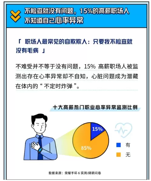 此次报告借助荣耀手环6 的TruSeenTM 4.0心率监测技术,监测出15%高薪职场人存在心率异常,但多数职场人却对此毫不知情。近期猝死案例频发,用户对心脏健康管理缺乏足够认知是重要原因。