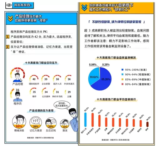 除此以外,职场高压环境也在威胁“打工人“的身体健康。据报告数据得出,过四成职场人表示因压力过大而导致记忆力衰退。另外还有职场人易感到精神不振效率低,其实和血氧息息相关,数据显示超三成高薪职场人检测出轻度缺氧,尤其脑力工作者更需引起关注。