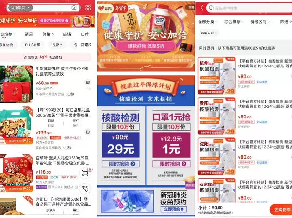 2月3-5日每天10点起,登录京东App搜索关键词“健康年货”后,点击搜索框下方页面,即可进入“健康过年保障计划”页面领取优惠券。领券后用户可在7日内购买、40天内预约核酸检测。目前该优惠服务可覆盖上海、广州、天津等24个城市。