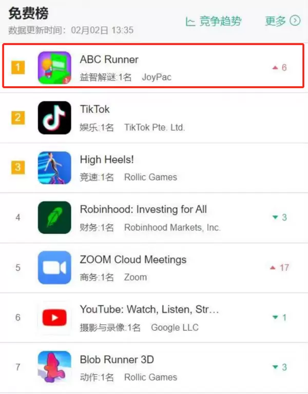 近日,由游戏发行商JoyPac发行的一款益智类超休闲游戏《ABC Runner》一口气摘下了美国iOS免费榜总榜冠军,并同时登顶免费游戏类、免费家庭聚会类、免费益智解谜类多个榜单,收割了众多海外玩家的喜爱。