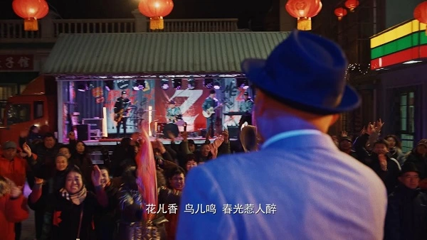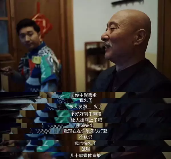日复一日,父子各自为了心中的热爱努力,家里忽明忽暗不停晃动的灯泡,也换成了巨大的美式吊灯。儿子小牛傲娇地跟父亲宣告自己在许浪乐队打鼓,让父亲上网搜“菜刀鼓王”看看自己的演出。而当老牛终于走上社区晚会舞台,因为紧张唱走音的时候,小牛带着乐队成员来到现场,与父亲合唱一首摇滚版《年轻的朋友来相会》,震撼全场引发大合唱,老牛与小牛都“火”了。